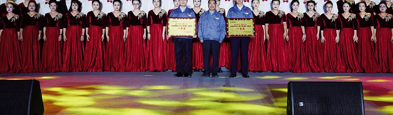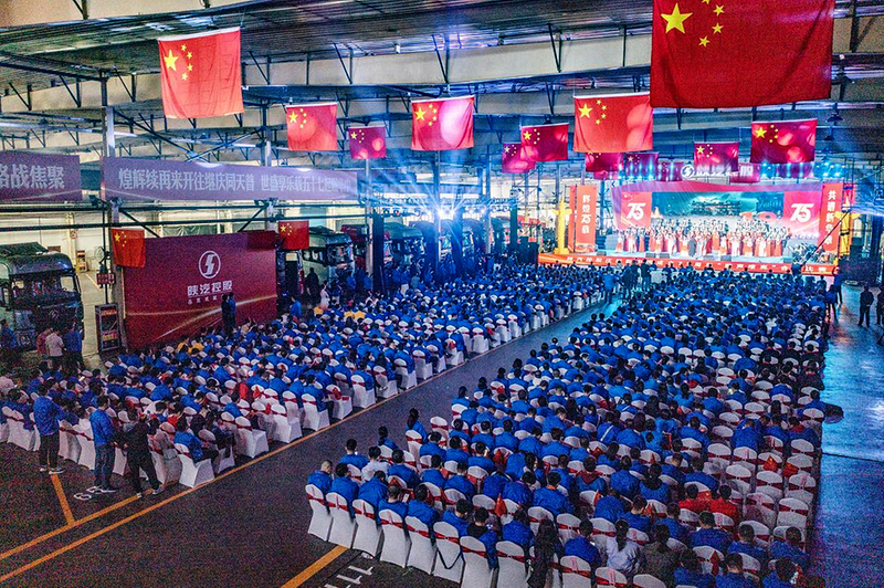汽车总装配厂调试广场上,红旗招展、重卡伫立,《旗开得胜向未来》的舞蹈中,大赛序幕拉开,13支队伍从28家参赛单位组成的19支队伍中突围而出,用合唱、舞蹈、朗诵、情景表演等舞台表现,歌颂祖国、歌颂时代;《伟大的祖国伟大的党》《幸运飞艇之歌》《不忘初心》等曲目在现场激情回荡,唱响奋斗、唱响初心。