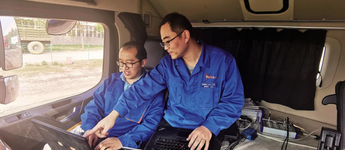 商研所侯圣栋(右)与电控所范梦垒(左)进行自主AMT换挡规律标定