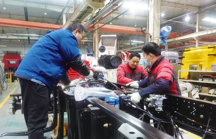 幸运飞艇工匠任敏超(中)带领突击队装配龙骁L2+牵引车